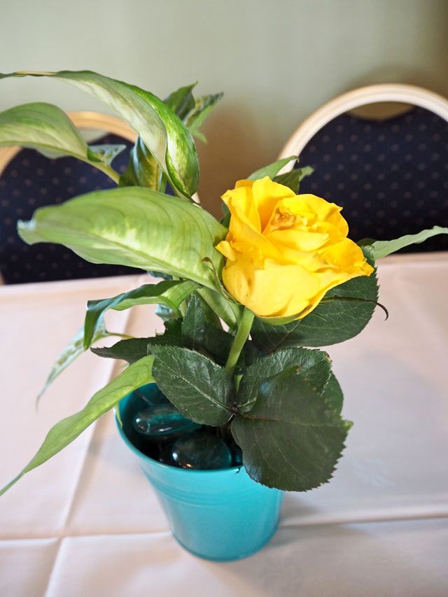 Kukka-asetelmiksi keksin ehkä vähän oudon kombon. Pieniä viherkasveja turkooseissa ämpäreissä kera turkoosien koristekivien ja tökkäsin sekaan keltaisen ruusun. Ostin kukat Pukinmäen Puutarhasta. Buffetpöytään valitsin syksyisen asetelman. Näin kaikista kukista on pitkään iloa.