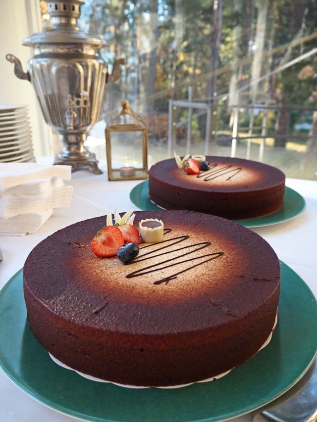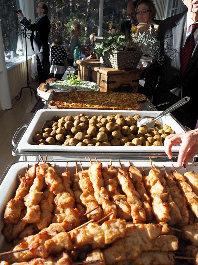 Theron catering hoiti tilan ja ruokatarjoilut. Minä aloin miettimään vasta pari päivää ennen juhlia muita hoidettavia asioita. Juomatarjoilut hoidimme itse ja tarjolla oli samppanjaa ja omenamehua lapsille. Tarjolla oli kasvispiirakkaa, falafel-pyöryköitä, kanavartaita, salaattia ja leipävalikoima. Takuuvarma herkku on Theron Cateringin kolmen suklaan kakku. Jälkiruoaksi oli myös hedelmäsalaattia.