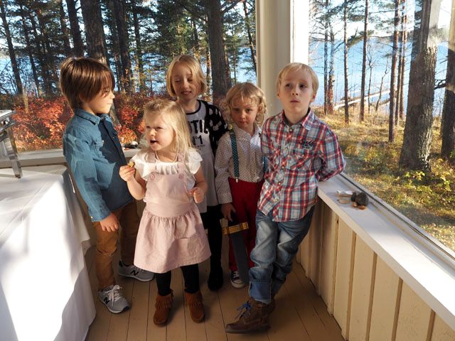 Vieraita oli viitisenkymmentä ja lapset olivat innoissaan jännittävästä huvilasta. Vauhti oli kova, kun he temmelsivät yläkerrassa. Kaikki mahtuivat istumaan pöytiin samassa tilassa.